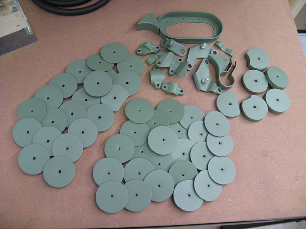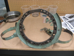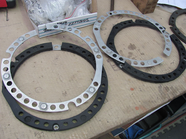 Work has continued on the engine installation and one job that we have started is the repair of the coolant header tank mount. This is a rubber bonded vibration absorbing ring that connects the tank mount straps to the front of the engine. We have removed all traces of the original rubber and had the face plates plated. We have cut new sheet rubber to size and have bonded it to the original mount plates.