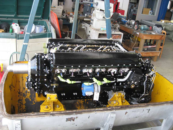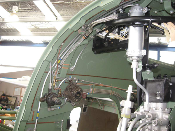 The R/H engine has arrived and we have begun preparations for installation. The fire suppression pipes that wrap around the carburetor and over the top of the supercharger and forward along the cylinder banks have all been installed.