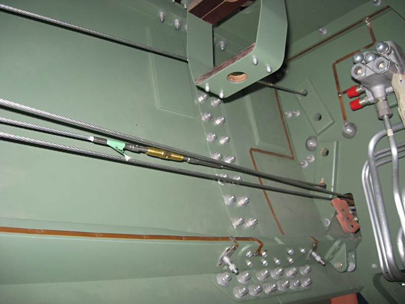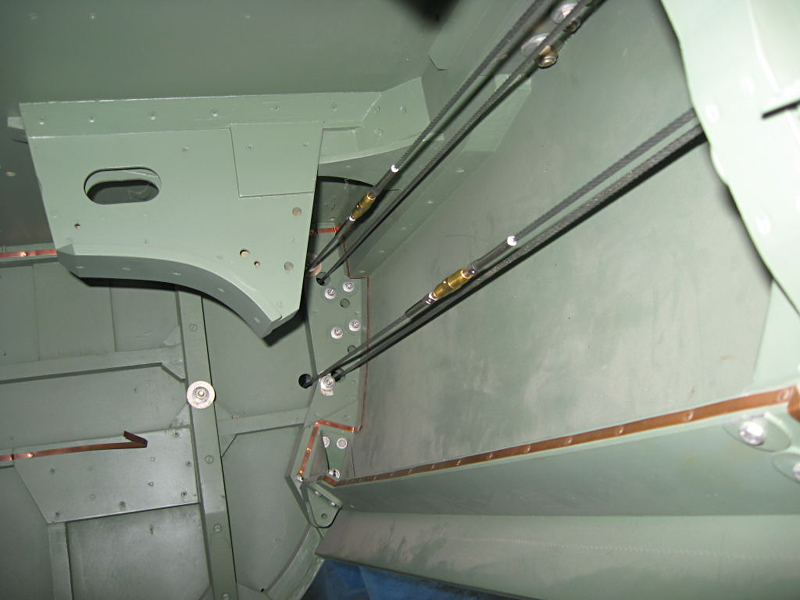 We have received the new manufacture rudder and elevator cables and these have now been installed and rigged in both the elevator and rudder systems. The cables run through the lower bomb bay area before attaching to the differential and counter weight assembly. From there more cables travel back to the surfaces themselves. We will fit these rear cables next month.