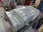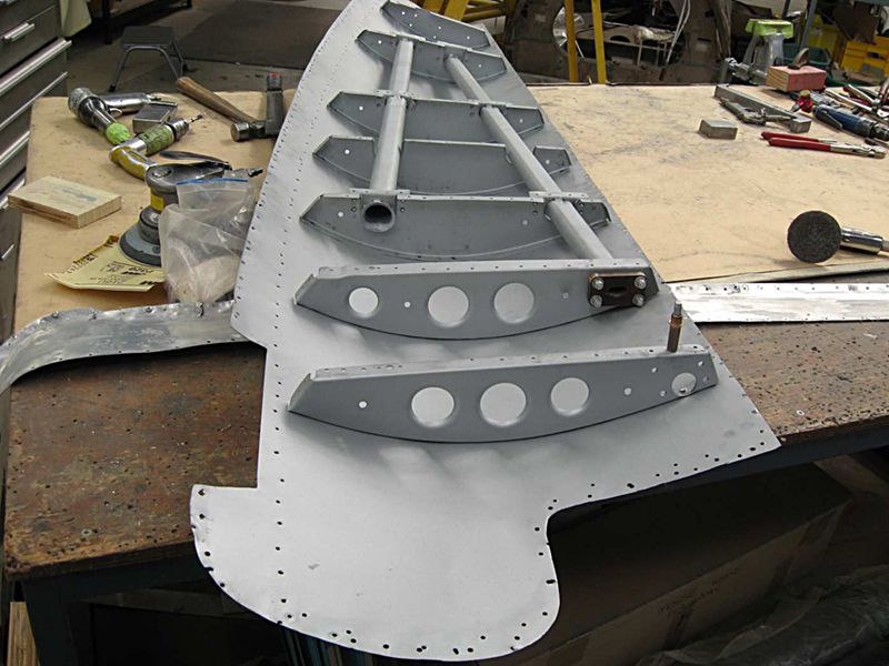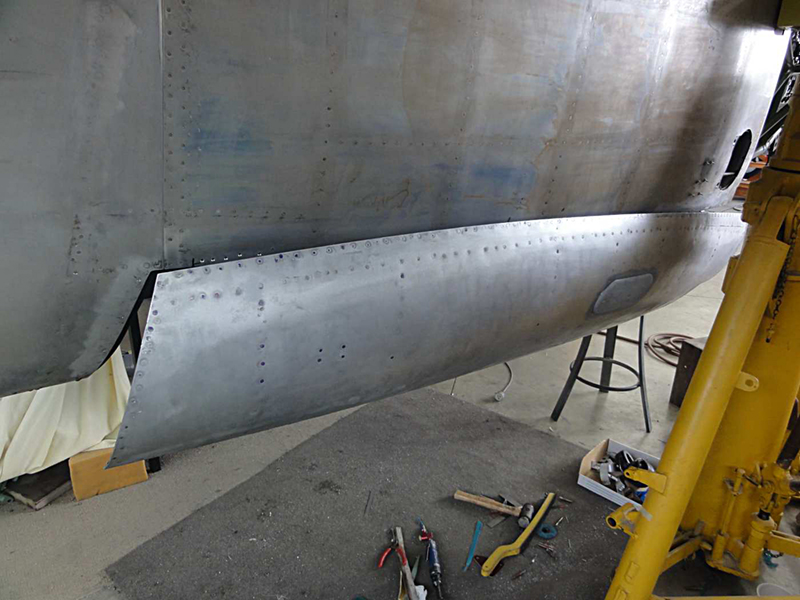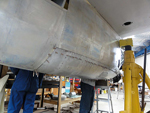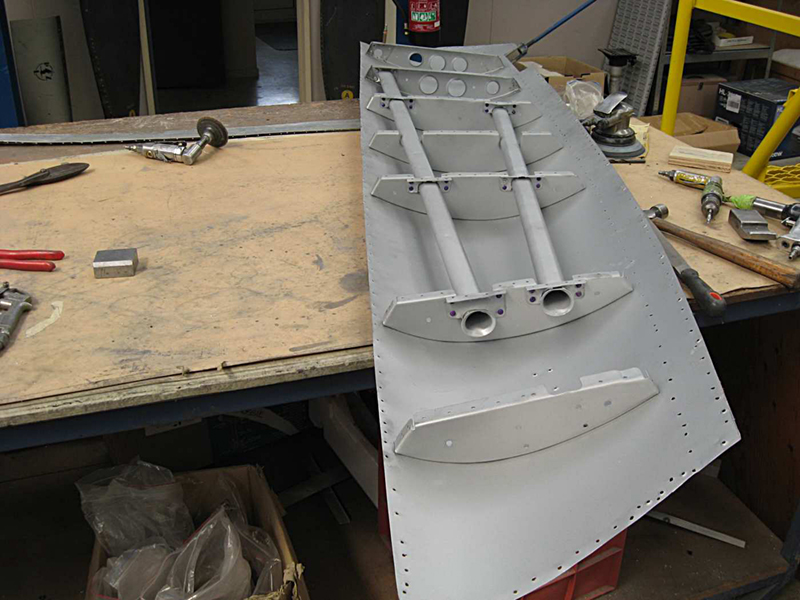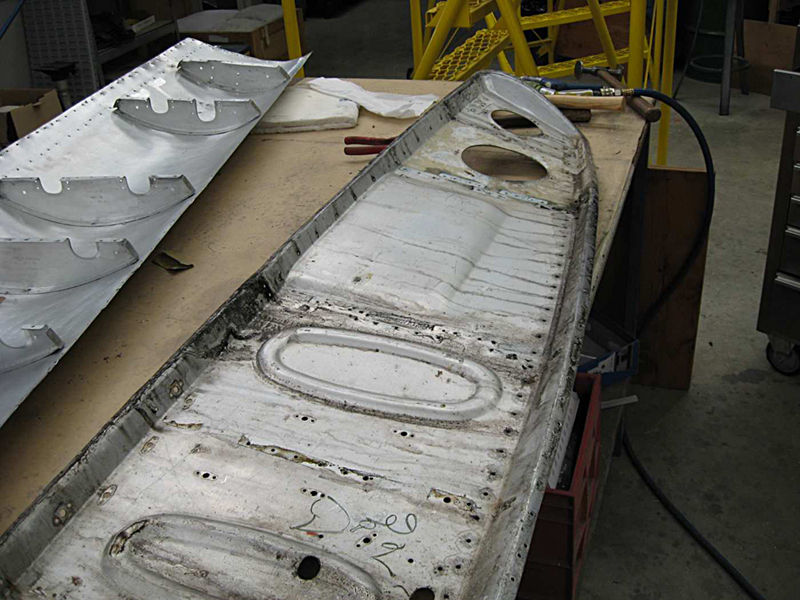 We have continued work on the rebuild of the main gear doors. The left hand doors are now complete and we have moved onto the right hand pair. The outboard door is one we acquired from John Smith and as it was in relatively good condition we have been able to use the skins on this one and have left the ribs attached to the outer skin. It did require a small patch to some damage in the front top corner, but this will be barely noticeable after the paint is applied. It is now complete and we have started on the inboard door. Sadly this one is not so good and has quite extensive corrosion throughout.