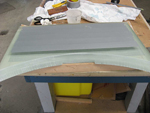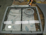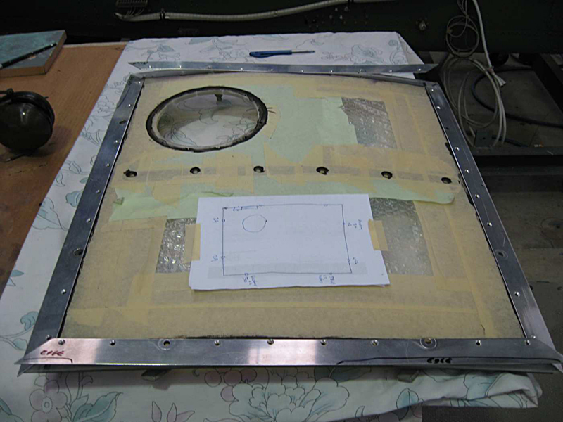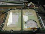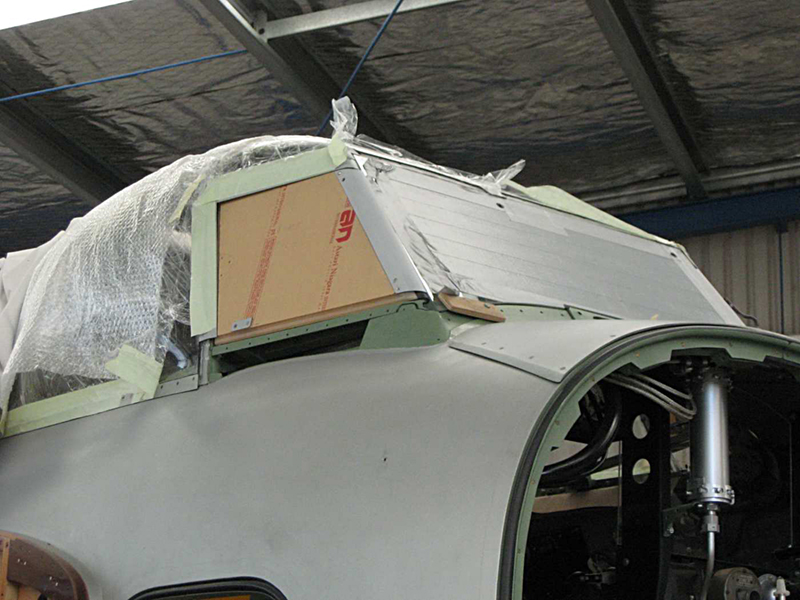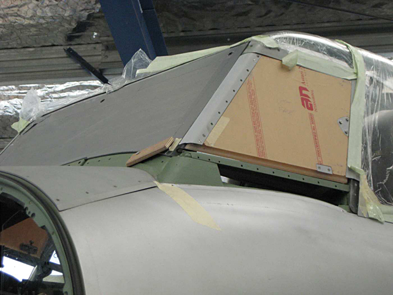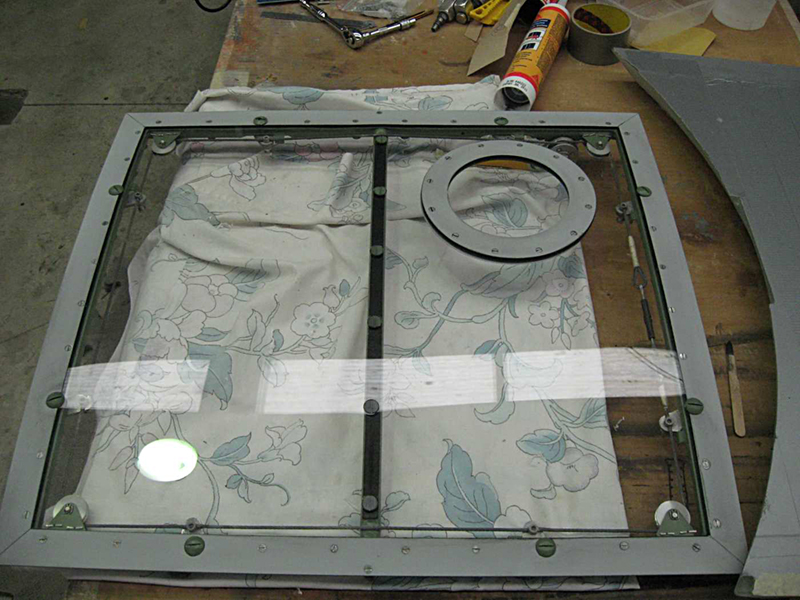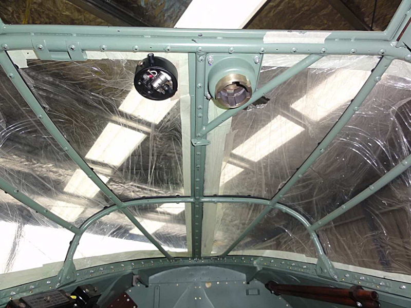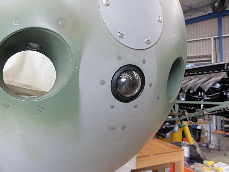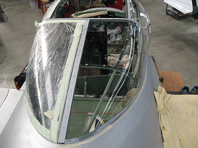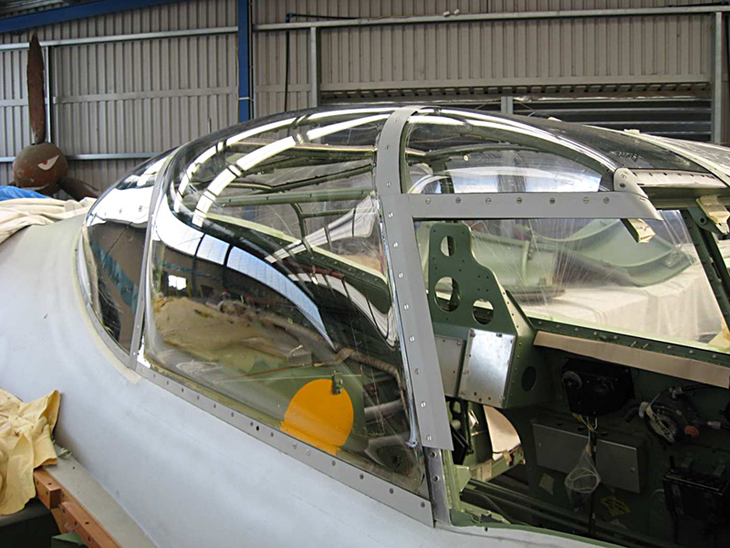 We have continued with the canopy glazing and have completed the rear main section with the right rear corner the last piece to be fitted. We have also made good progress on the overhaul of the escape hatch and it is now complete with its new Perspex and small escape panel which allows access from outside. Basically rescuers would punch the small round panel inwards and grab the main handle to open the hatch. We have had the front screen delivered from the glass shop and have polished the edges where the sliding windows seal and are working on the closing strips and the armour plate detailing on the upper nose section.